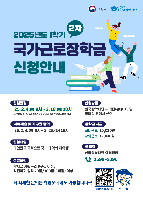 *국가장학금(근로) 신청기간: 2025년 2월 4일(화) 9시 ~ 3월 18일(화) 18시 ⏰