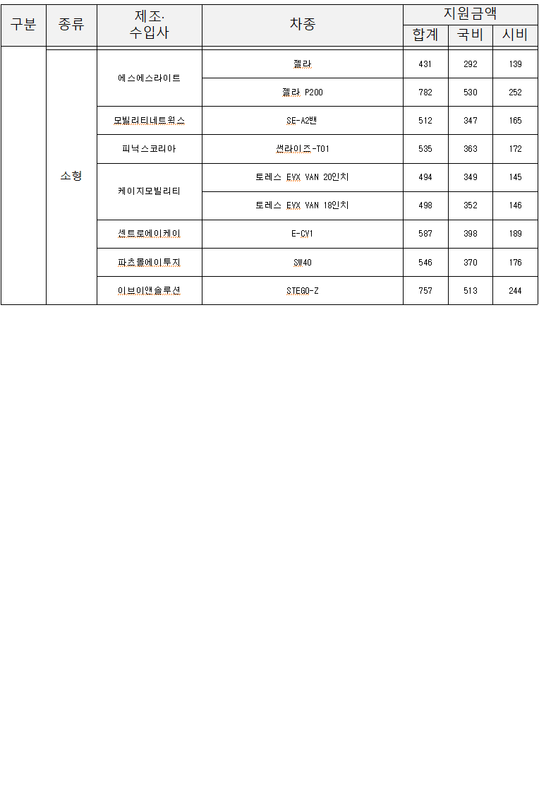 차종별 최대 지원 금액은 다음과 같습니다: