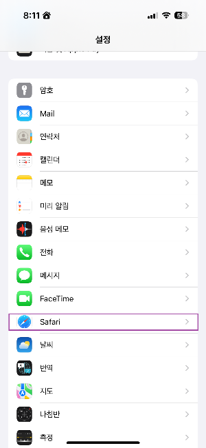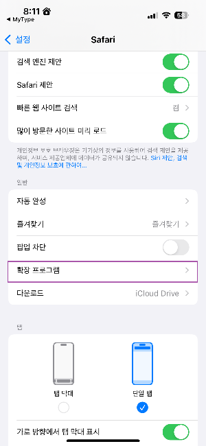 1) 'MyType 어플' 실행하여 'Safari 설정 열기' 선택 또는 '홈화면' -> '설정' -> 'Safari' 선택