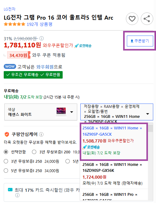 현재 특가로 판매 중인 16Z90SP-GA5CK 모델을 구매하시는 것이 훨씬 이득입니다!