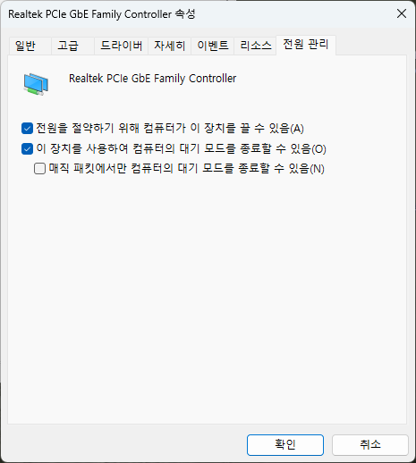 3. 전원관리 -> '이 장치를 사용하여 컴퓨터의 대기 모드를 종료할 수 있음' 활성화