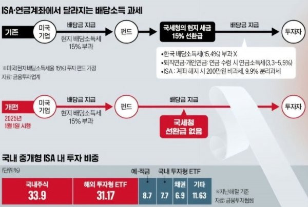 - 기존: 미국주식ETF배당금 배당소득세 원천징수(15%) -> 국세청 환급(15%) -> 배당금 투자자 지급(국내 세율)